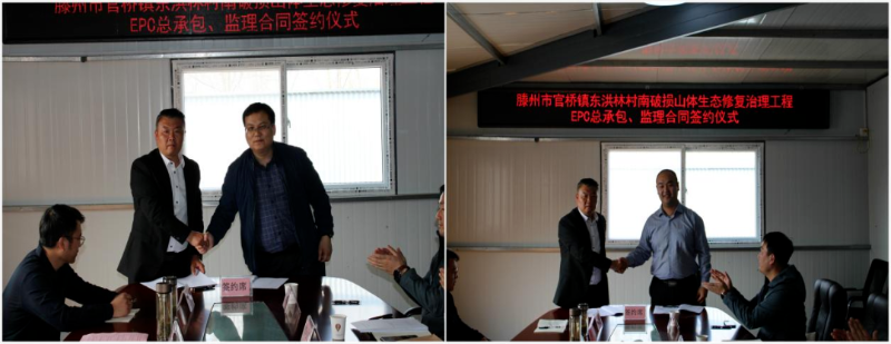 签约仪式上,滕州官桥生态环境产业发展有限公司与山东省鲁南地质工程勘察院签署了滕州市官桥镇东洪林村南破损山体生态修复治理工程EPC总承包合同;与山东省地质矿产勘查开发局第八地质大队签署了滕州市官桥镇东洪林村南破损山体生态修复治理工程监理合同。