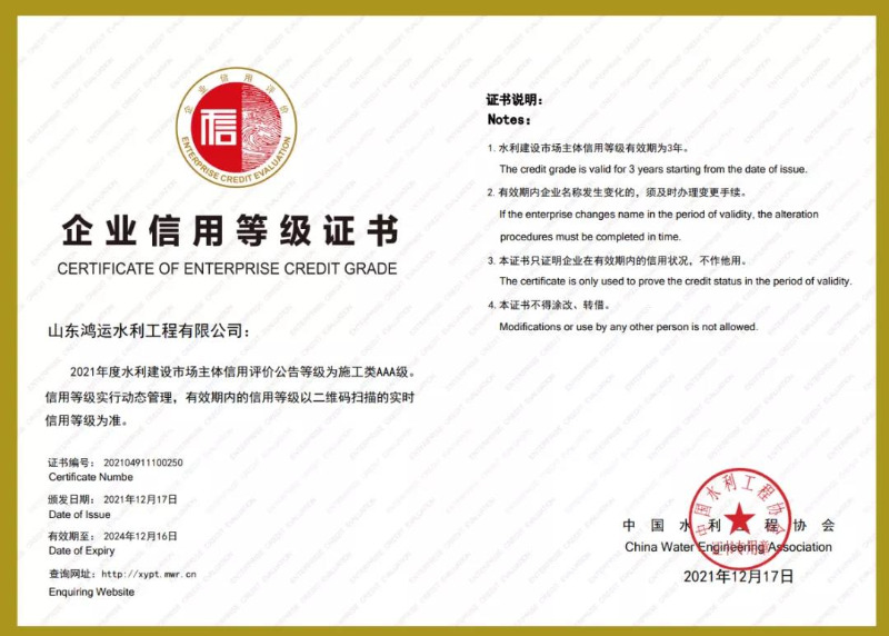 2021年12月17日,中国水利工程协会公布了2021年度全国水利建设市场主体信用评价结果,集团公司所属山东鸿运水利工程有限公司喜获AAA信用等级证书。