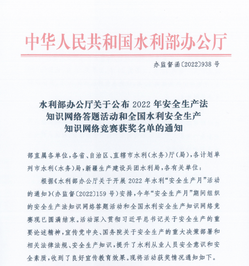 近日,水利部办公厅印发《关于公布2022年全国水利安全生产知识网络竞赛——《水安将军》活动获奖名单的通知》,我公司张桂、刘森两名同志成绩优异、脱颖而出,以全国排名第107名、第115名荣获优胜奖。