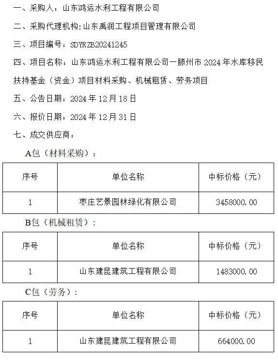 山东鸿运水利工程有限公司—滕州市2024年水库移民扶持基金(资金)项目材料采购、机械租赁 、劳务项目成交公示