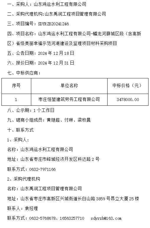 山东鸿运水利工程有限公司-蟠龙河薛城区段(含高新区)省级美丽幸福示范河湖建设及监理项目 材料采购项目成交公示