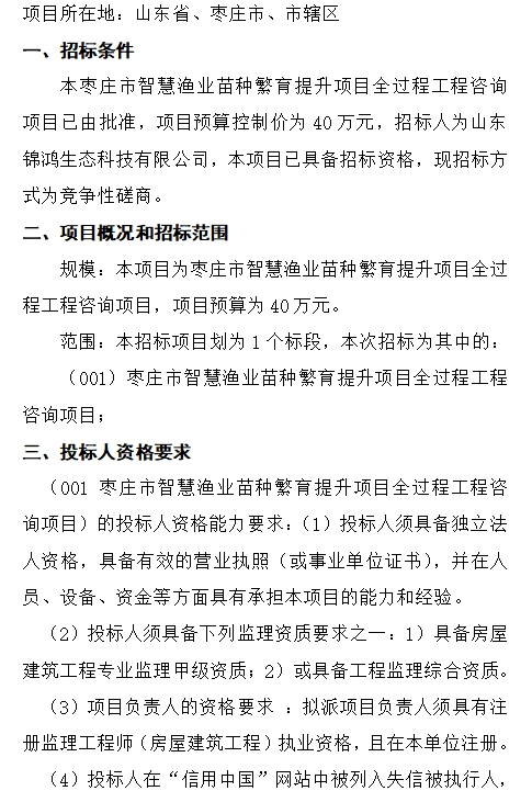 枣庄市智慧渔业苗种繁育提升项目全过程工程咨询项目竞争性磋商公告