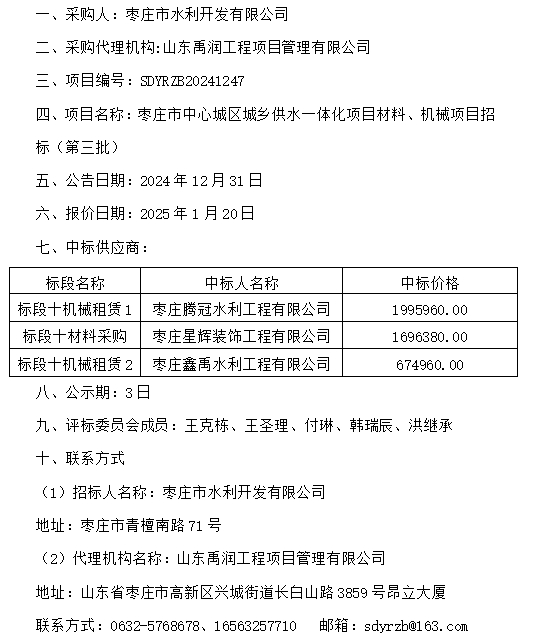 枣庄市中心城区城乡供水一体化项目材料、机械项目招标(第三批)中标公示