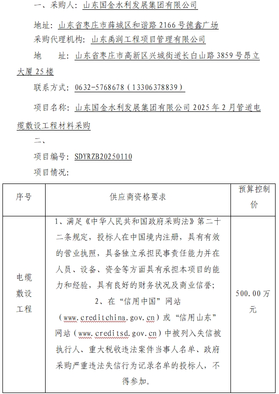 山东国金水利发展集团有限公司2025年2月管道电缆敷设工程材料采购竞争性磋商公告